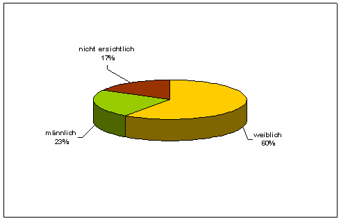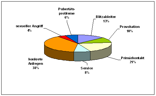 unterteilt. Art des Anrufs 2005 ist ein Anstieg bei den Anrufen mit konkreten Anliegen im Zusammenhang mit Gewalt erfolgt. 38% der Anrufe waren konkrete Fragen rund um die Gewaltproblematik (2004: 30%). Auch der Anteil der Serviceanrufe ist gestiegen. 8% (2004: 5%) der Anrufe sind so genannte Serviceanrufe. Darunter fallen Anfragen von Institutionen, die mit dem Thema Gewalt konfrontiert sind und Informationen benötigen, z.B. von Angehörigen, die Betroffene unterstützen und sich nach regionalen Beratungsmöglichkeiten erkundigen und/oder Informationen zur spezifischen Dynamik von Gewaltbeziehungen wollen (eine häufige Frage in diesem Zusammenhang, die Personen aus dem sozialen Nahraum der Betroffenen stellen: „Das geht schon so lange so. Warum verlässt sie ihn nicht endlich?“). In vielen Fällen gehen solche Serviceanrufe im Sinne der Entlastung und Stärkung der Vertrauenspersonen von Betroffenen natürlich auch in Beratungsgespräche über. Als zusätzliches Service bietet die Frauenhelpline auch den Versand von Infomaterialien sowie Recherchen im Internet an. So werden Informationen kundInnenfreundlich und unbürokratisch weitergegeben. Unter Blitzableiter (13%) werden jene Anrufe zusammengefasst, bei denen das kostenlose Beratungstelefon vorwiegend von Kindern und Jugendlichen als „Container“ für Frustrationen, Verletzungen, Enttäuschungen, „Sich-nicht-ernst-genommen-fühlen“ etc. verwendet wird. Die Gesprächsinhalte haben oft aggressiven Charakter, sie werden jedoch nicht als persönliche Angriffe gegen die Beraterin kommuniziert. Personen, die beim ersten Anruf nicht den Mut haben, über ihre eigentlichen Probleme zu sprechen, werden der Rubrik Primärkontakt (21%) zugeordnet. Oft ist hier beispielsweise zu hören „Entschuldigung, hab mich verwählt“, „Falsch verbunden“ etc., oder es werden von Kindern und Jugendlichen für die Beraterin eindeutig nicht der Realität entsprechende Geschichten konstruiert, um die Reaktionen der Beraterinnen zu testen und sozusagen den „Ernstfall zu proben“. Unter Pubertätsprobleme (6%) verstehen die Mitarbeiterinnen jene Anrufe, die in der einen oder anderen Form Fragen von Jugendlichen zur Pubertät beinhalten. Es werden allgemeine Fragen zum Thema Sexualität/Homosexualität, körperliche Entwicklung, Schwangerschaft, Beziehung, Freundschaft etc. gestellt. 4% der Anrufe fallen unter die Kategorie Sexueller Angriff. Dies sind beinahe ausschließlich von Männern und männlichen Jugendlichen getätigte Anrufe, bei denen die Beraterinnen mit sexualisierten Beschimpfungen konfrontiert sind. Anrufe, die aggressivere Inhalte als Blitzableiter-Anrufe hatten, wurden unter Provokation zusammengefasst. Ihr Anteil ist im Vergleich zu 2004 etwas gesunken. Statt 14% im Jahr 2004 waren es 2005 nur noch 10%. Es handelt sich um wiederholte Telefonate, die die betreffende Mitarbeiterin in ihrer Funktion als Beraterin provozieren sollen. Es sind vor allem Anrufe von Jugendlichen, die aller Wahrscheinlichkeit nach dem Testen von Grenzen dienen, aber im Besonderen auch den Sinn eines „Abreagierens“ und „Machtdemonstrierens“ haben können. Hier haben sie, wenn auch nur im Kleinen, die Macht den Inhalt des Gesprächs mehr oder weniger selbst zu bestimmen, ohne sich dabei „ein Blatt vor den Mund zu nehmen“, und es auch willkürlich zu beenden. Unter Umständen handelt es sich dabei aber auch um Anrufe von Erwachsenen, meist von Männern, die beispielsweise ihrer Ansicht Ausdruck verleihen, dass Frauen bereits genügend unterstützt, die eigentlich Benachteiligten der Gesellschaft jedoch die Männer seien. Geschlecht der AnruferInnen 60% der Anrufe kamen von Frauen und Mädchen. Das waren insgesamt 8.238 Anrufe. Ein hoher Anteil davon waren Mädchen und junge Frauen, die sich vielfach mit Pupertätsfragen an die Frauenhelpline wandten. Unter den 8.238 Anrufen von Frauen verzeichnet die Frauenhelpline etwa 36% (2966) Anrufe im Zusammenhang mit Gewalterfahrungen. Bei etwa 8% (659) der Anrufe waren akute Gewaltsituationen oder schwere Krisen der Grund für einen Anruf bei der Frauenhelpline. Von Stalking bzw. Psychoterror waren 5% (412) der weiblichen Anrufer betroffen. Mädchen und Frauen, die von Zwangsverheiratung betroffen waren, wandten sich ebenfalls an die Helpline. Immerhin 16 Anrufe konnte die Frauenhelpline im vergangenen Jahr verzeichnen. Wobei die Betroffenen selbst, Verwandte der Betroffenen oder MitarbeiterInnen aus Institutionen wie etwa aus Schulen oder Jugendzentren Unterstützung oder Auskunft bei der Frauenhelpline suchten. Neben den Anfragen zu Gewaltproblemen waren Themen wie die Bewältigung von schwierigen Lebenssituationen, Beziehungskrisen, Trennungs- und Scheidungsfragen, Besuchsrechtsregelungen, Schuldentilgung, Obdachlosigkeit etc.. Inhalt der Anrufe. Unter den Anruferinnen befinden sich jährlich auch sogenannte Mehrfachanruferinnen,