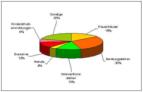 Bei der Verteilung der Anrufe auf die Bundesländer haben sich im Vergleich zum vergangenen Jahr nur geringe Veränderungen ergeben. 35% aller AnruferInnen, die ihre Herkunft bekannt gaben, kamen aus dem Raum Wien, 16% aus Niederösterreich, 17% aus der Steiermark, 9% aus Oberösterreich und 7% aus Kärnten. Die anderen Bundesländer bewegen sich auch 2005 zwischen 2% (Vorarlberg) und 6% (Tirol). Es werden nicht alle AnruferInnen automatisch nach ihrer Herkunft gefragt, lediglich jene, die den Ort im Beratungsgespräch bekannt geben und die an eine bestimmte Hilfseinrichtung weitervermittelt werden. Weitervermittlung Etwa 21% aller erfassten Anrufe wurden an andere Stellen weitervermittelt. Wie wichtig dabei Frauenberatungsstellen und Frauenhäuser sind, zeigt diese Tabelle. Unter die Rubrik „Sonstige” fallen Einrichtungen wie z.B. Kriseninterventionszentren, Männerberatungsstellen, Familienberatungsstellen, Institutionen, in denen Rechtsberatung angeboten wird etc.. |